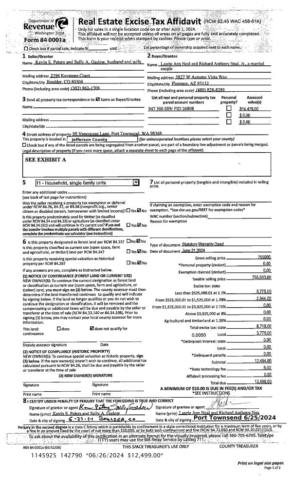 | 1 | 06/21/2024 | SWD | Statutory Warranty Deed | KEVIN S PETERS & SALLY A GADOW | LAURIE A & RICHARD A NEAL JR | | | $755,000.00 | 142790 | |
