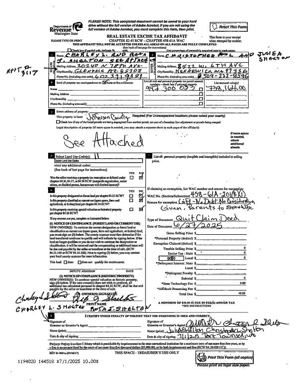 | 2 | 06/27/2025 | QCD | Quit Claim Deed | CHARLEY L SHELTON | CHRISTOPHER L & JULIE A SHELTON | | | | 144518 | |