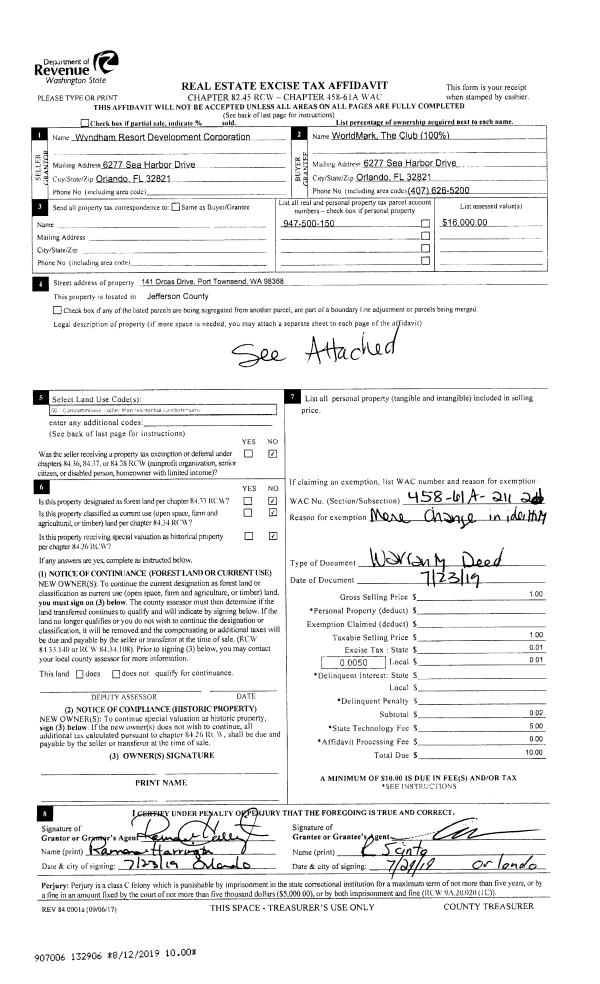 | 1 | 07/23/2019 | WD | Warranty Deed | WYNDHAM RESORT DEVELOPMENT CORPORATION | WORLDMARK THE CLUB | | | | 132906 | |