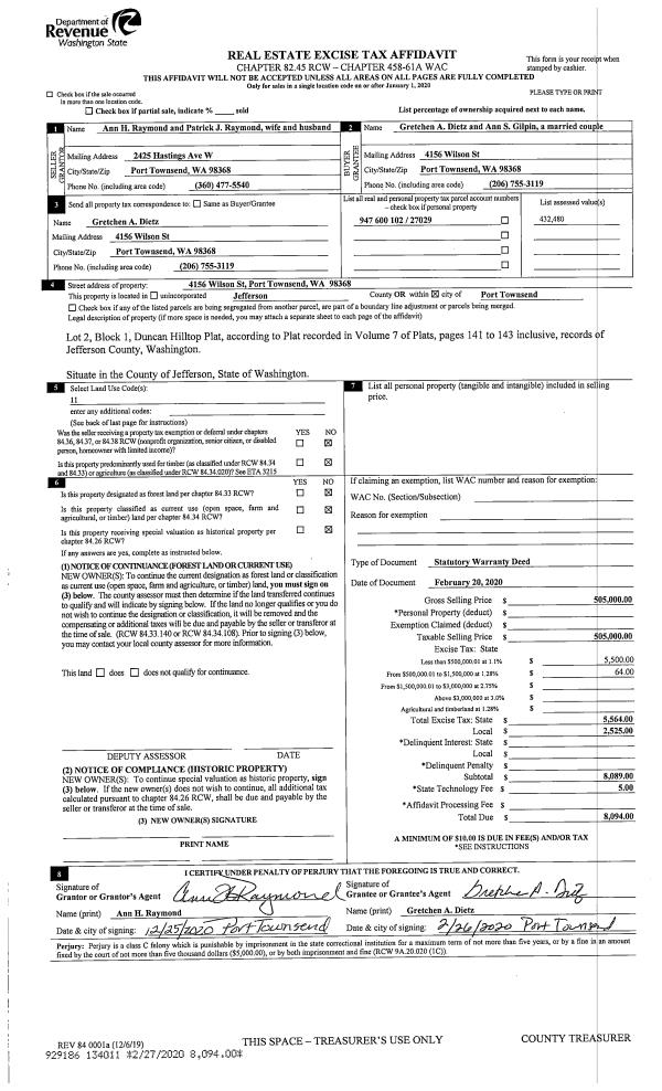 | 1 | 02/20/2020 | SWD | Statutory Warranty Deed | ANN H & PATRICK J RAYMOND | GRETCHEN DIETZ & ANN GILPIN | | | $505,000.00 | 134011 | |