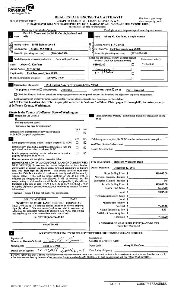 | 2 | 12/13/2017 | SWD | Statutory Warranty Deed | DAVID L & JUDITH R CORNIS | ABBEY G KAUFMAN | | | $419,000.00 | 129281 | |