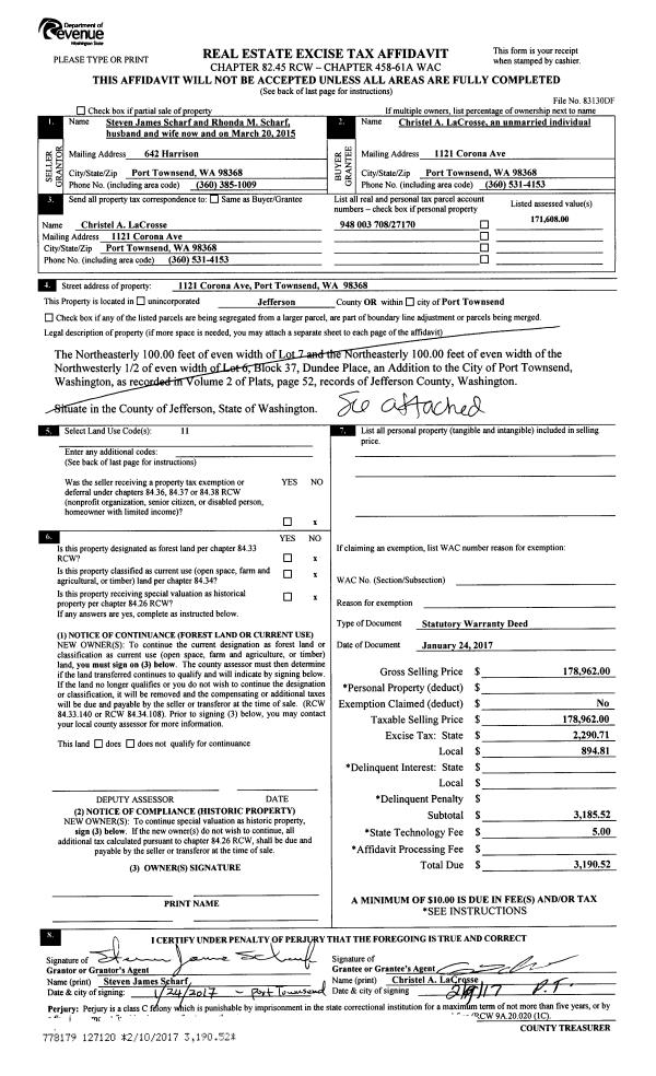 | 2 | 01/24/2017 | SWD | Statutory Warranty Deed | STEVEN SCHARF | CHRISTEL A LACROSSE | | | $178,962.00 | 127120 | |