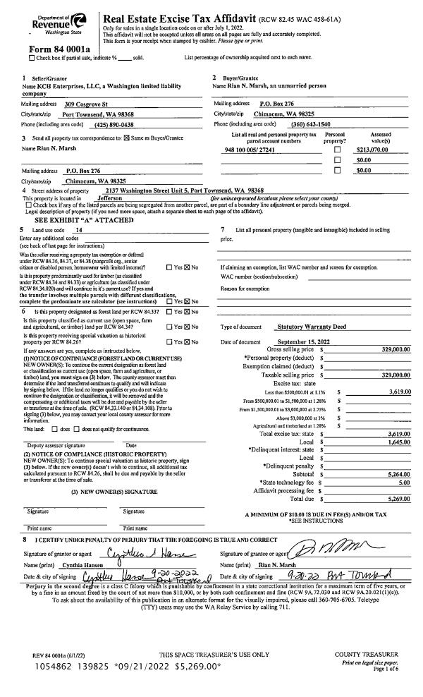 | 2 | 09/15/2022 | SWD | Statutory Warranty Deed | KCH ENTERPRISES LLC | RIAN N MARSH | | | $329,000.00 | 139825 | |