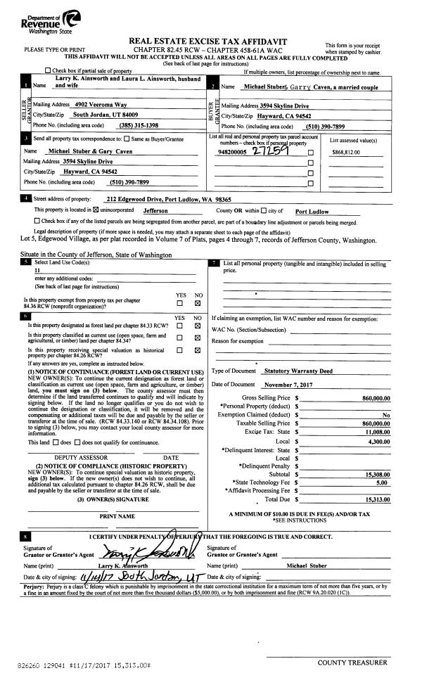 | 1 | 11/07/2017 | SWD | Statutory Warranty Deed | LARRY K AINSWORTH | MICHAEL STUBER & GARRY CAVEN | | | $860,000.00 | 129041 | |