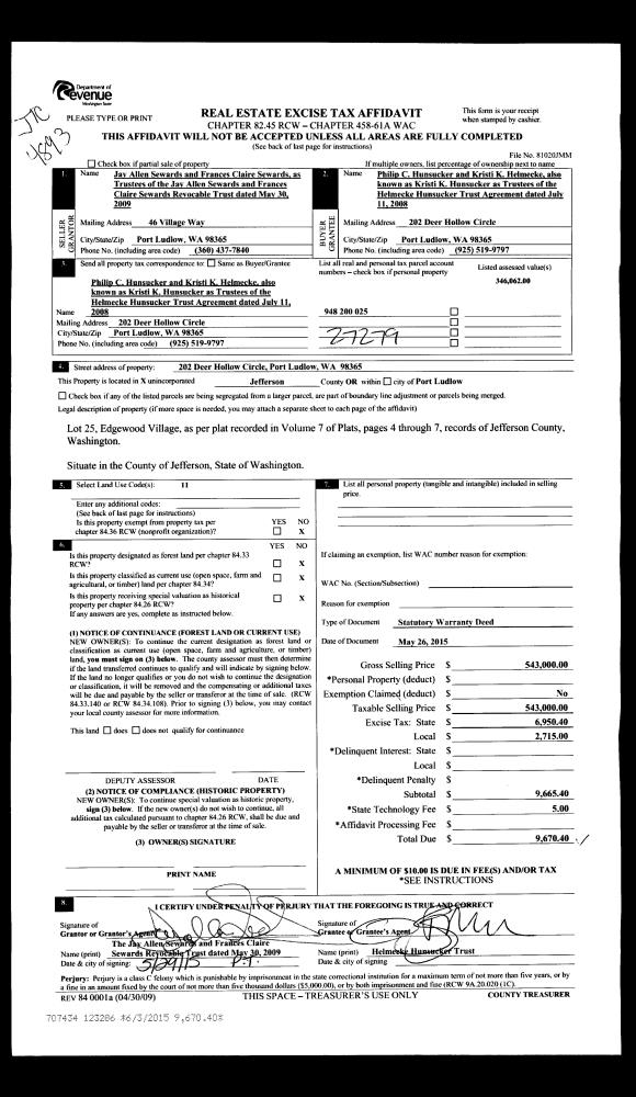 | 1 | 05/26/2015 | SWD | Statutory Warranty Deed | JAY A SEWARDS TRSTEE | HELMECKE HUNSUCKER TRUST | | | $543,000.00 | 123286 | |