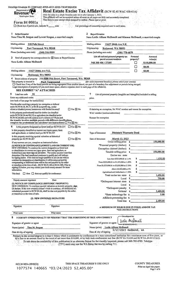 | 1 | 03/13/2023 | SWD | Statutory Warranty Deed | TINA M SEZGUN | LESLIE A & KINNON MCDONELL | | | $150,000.00 | 140665 | |
