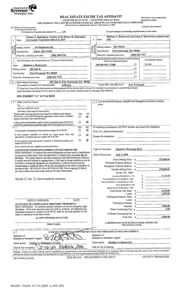 | 2 | 07/07/2020 | SWD | Statutory Warranty Deed | ROBERT H DISHINGTON IRREVOCABLE TRUST | MATTHEW J & ANNA P ROMCEVICH | | | $375,000.00 | 134656 | |
