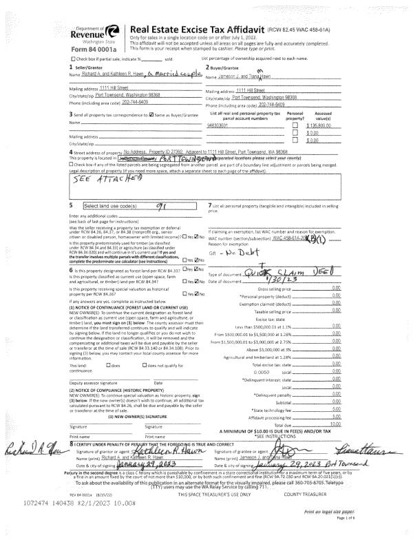 | 1 | 01/30/2023 | QCD | Quit Claim Deed | RICHARD A HAWN | JAMESON J & TIANA M HAWN | | | | 140438 | |