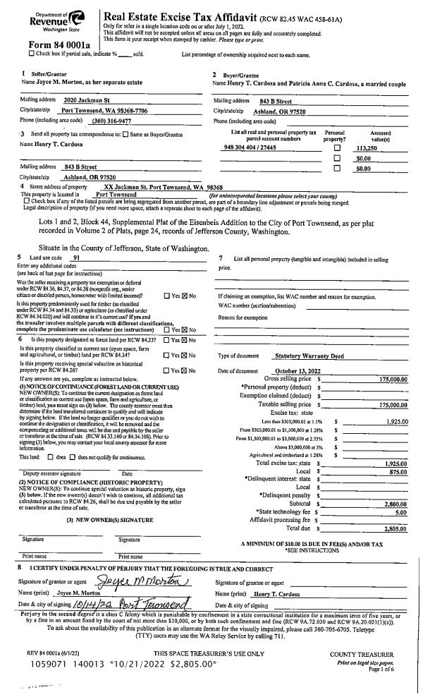 | 2 | 10/13/2022 | SWD | Statutory Warranty Deed | JOYCE MORTON | HENRY T & PATRICIA ANNE C CARDOSA | | | $175,000.00 | 140013 | |