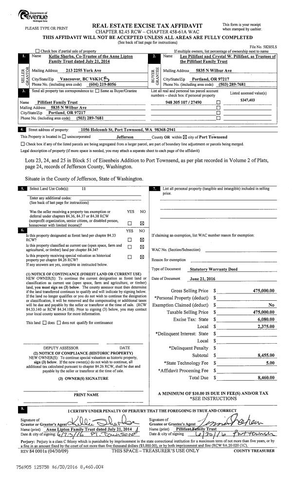 | 1 | 06/21/2016 | SWD | Statutory Warranty Deed | ANNE LIPTON FAMILY TRUST | PILLIFANT FAMILY TRUST | | | $475,000.00 | 125758 | |