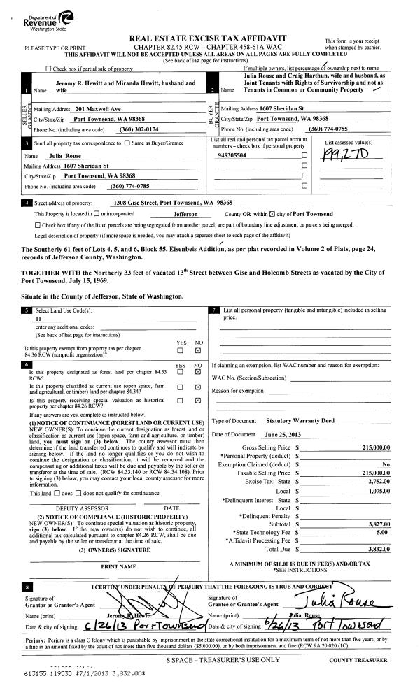 | 2 | 06/25/2013 | SWD | Statutory Warranty Deed | JEROMY R HEWITT | JULIA ROUSE | | | $215,000.00 | 119530 | |