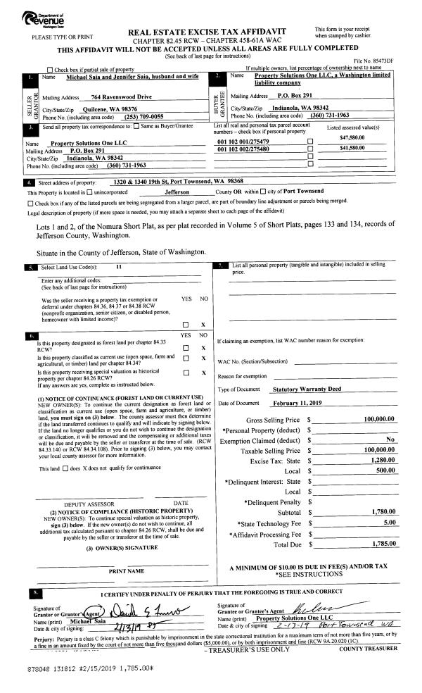 | 3 | 02/11/2019 | SWD | Statutory Warranty Deed | MICHAEL C & JENNIFER SAIA | PROPERTY SOLUTIONS ONE LLC | | | $100,000.00 | 131812 | |