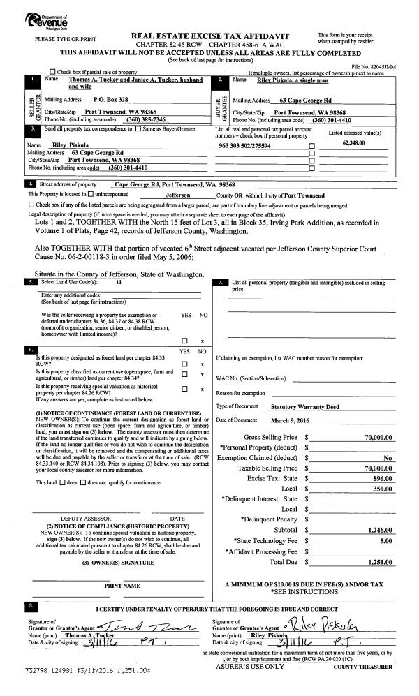 | 1 | 03/09/2016 | SWD | Statutory Warranty Deed | THOMAS TUCKER | RILEY PISKULA | | | $70,000.00 | 124981 | |