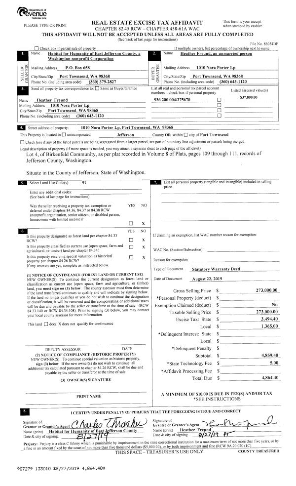 | 1 | 08/22/2019 | SWD | Statutory Warranty Deed | HABITAT FOR HUMANITY OF EAST | HEATHER FREUND | | | $273,000.00 | 133010 | |