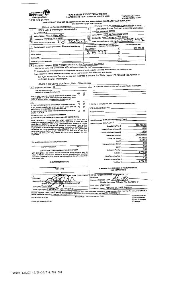 | 2 | 02/24/2017 | SWD | Statutory Warranty Deed | CAFS LLC | ALEXANDRA F REDMAN | | | $268,500.00 | 127203 | |