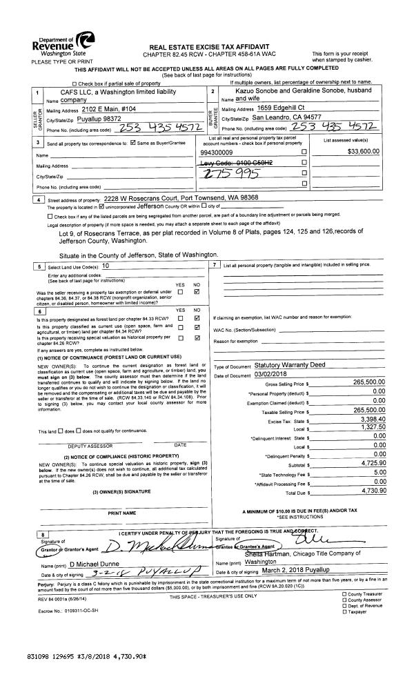 | 1 | 03/02/2018 | SWD | Statutory Warranty Deed | CAFS LLC | KAZUO & GERALDINE SONOBE | | | $265,500.00 | 129695 | |