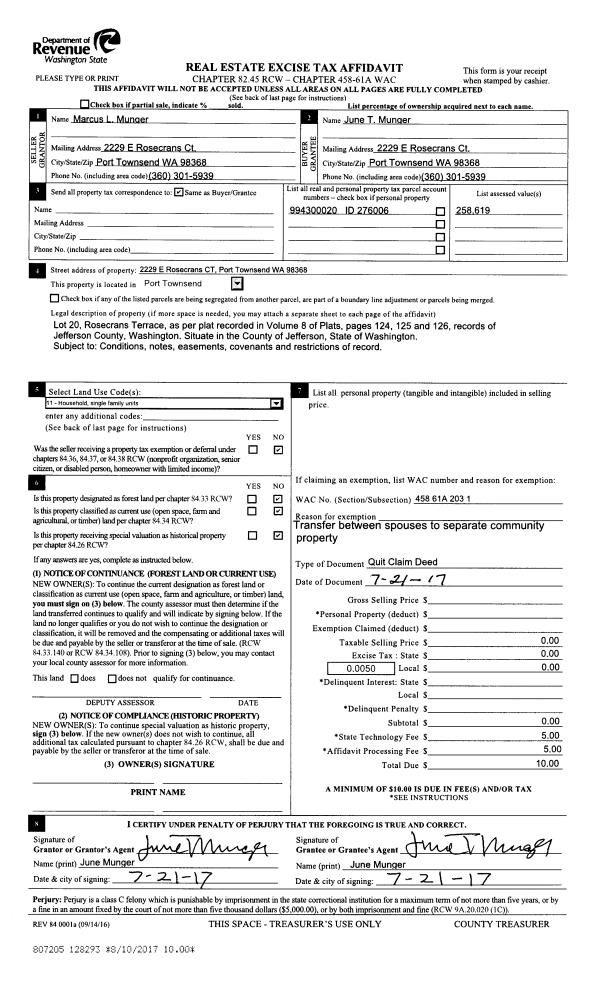 | 1 | 11/10/2022 | SWD | Statutory Warranty Deed | JUNE T MUNGER | DAVID & MARGARET GERRIETS REV TRUST | | | $475,000.00 | 140143 | |