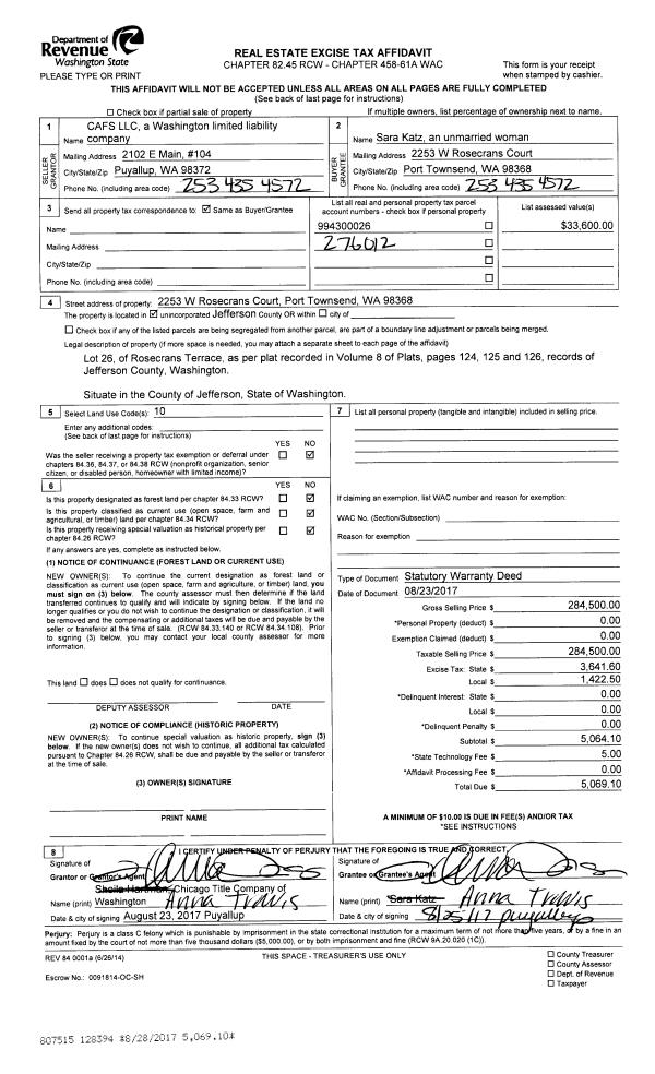 | 1 | 08/23/2017 | SWD | Statutory Warranty Deed | CAFS LLC | SARA KATZ | | | $284,500.00 | 128394 | |