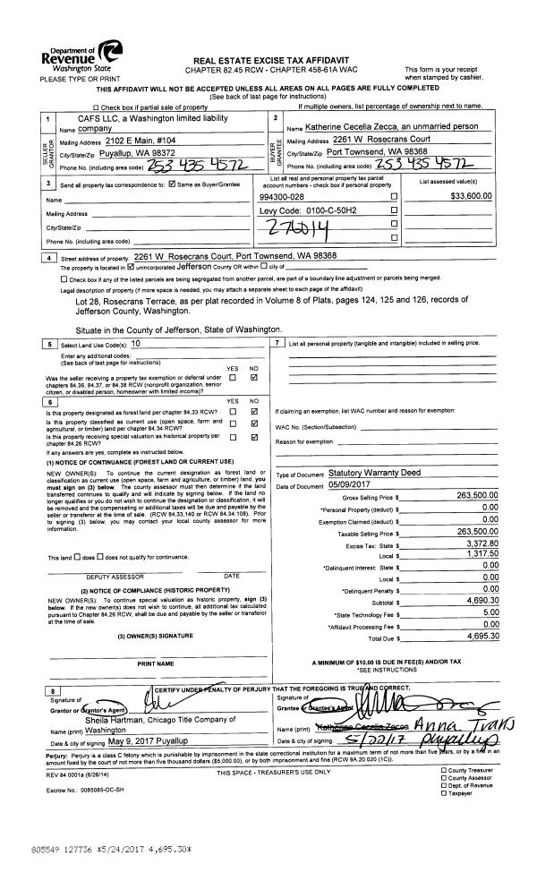 | 1 | 05/09/2017 | SWD | Statutory Warranty Deed | CAFS LLC | KATHERINE C ZECCA | | | $263,500.00 | 127736 | |