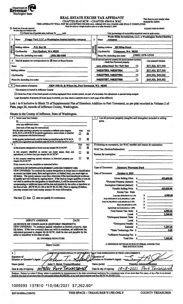| 2 | 10/06/2021 | SWD | Statutory Warranty Deed | FROGGY TURF LLC | WADE HILDA INVESTMENTS LLC | | | $453,600.00 | 137810 | |