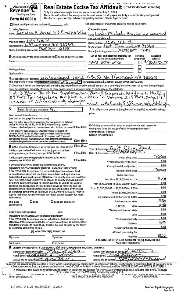 | 1 | 08/29/2024 | QCD | Quit Claim Deed | CHARLES W COX | LINDA M FRAZIER | | | $500.00 | 143128 | |