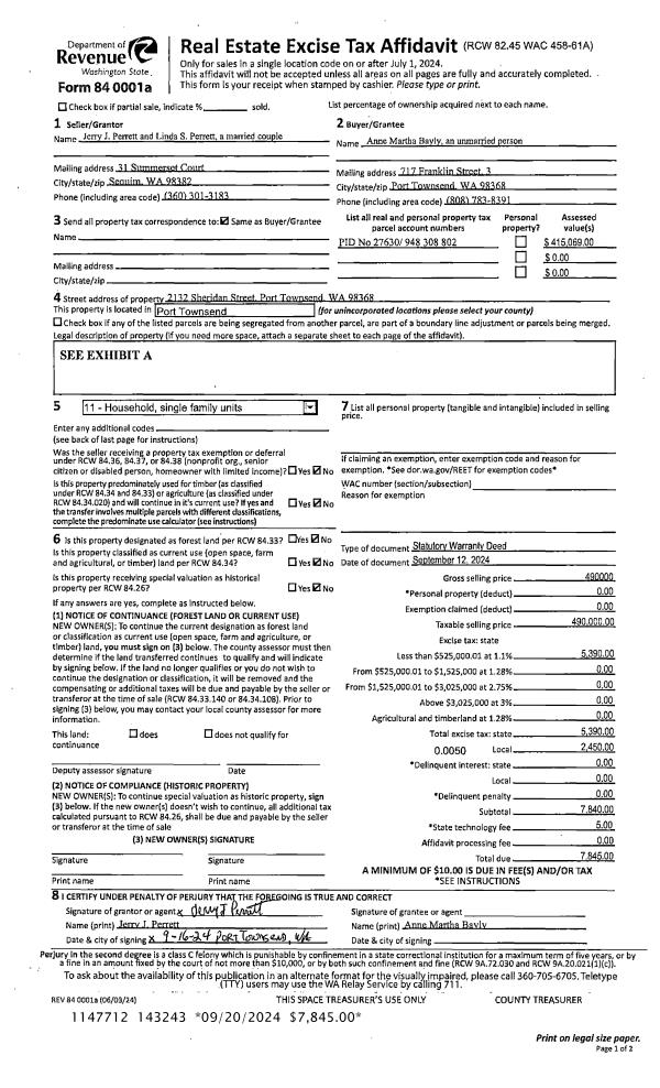 | 1 | 09/12/2024 | SWD | Statutory Warranty Deed | JERRY J PERRETT | ANNE M BAYLY | | | $490,000.00 | 143243 | |