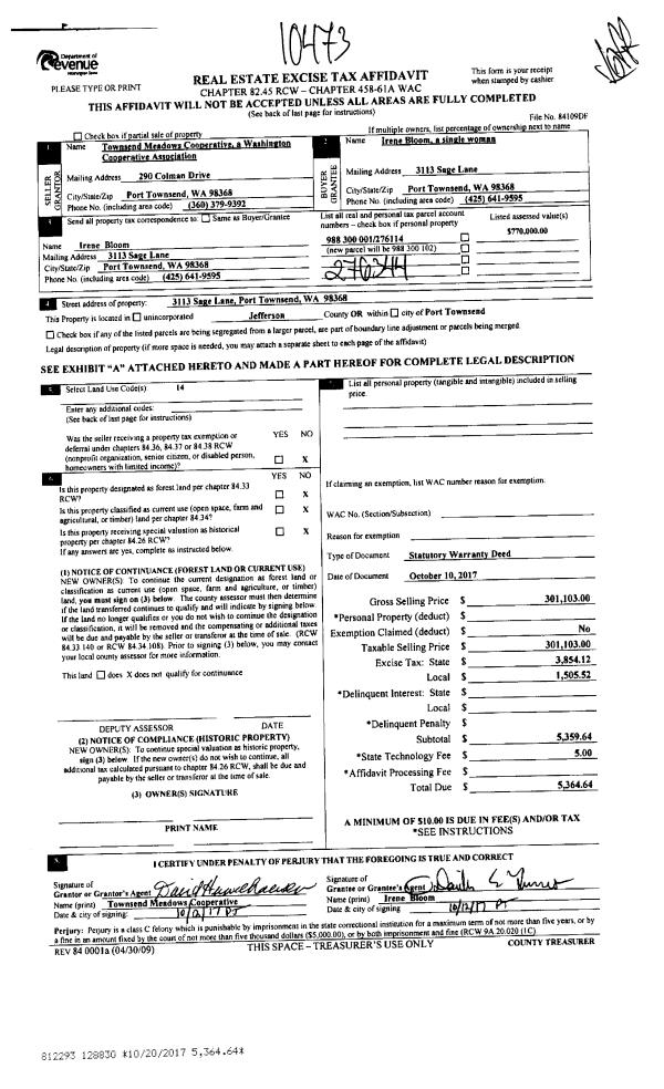| 1 | 10/10/2017 | SWD | Statutory Warranty Deed | TOWNSEND MEADOWS COOPERATIVE | IRENE BLOOM | | | $301,103.00 | 128830 | |