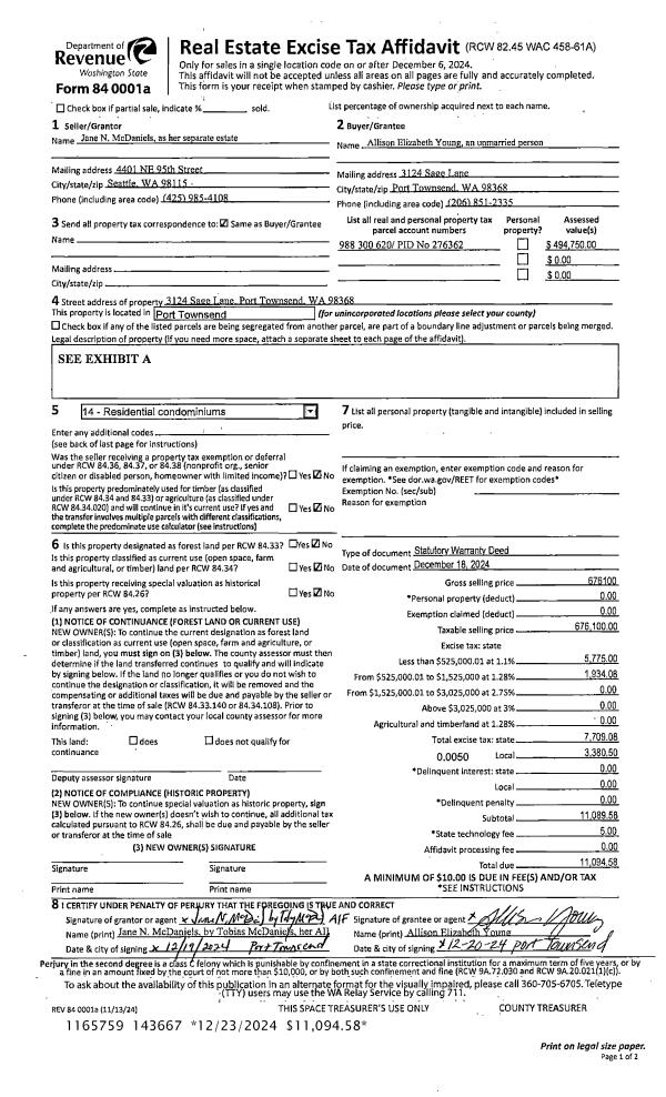 | 1 | 12/18/2024 | SWD | Statutory Warranty Deed | DAVID P & JANE N MCDANIELS | ALLISON E YOUNG | | | $676,100.00 | 143667 | |