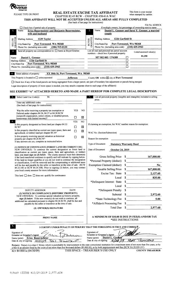 | 4 | 03/19/2019 | MISC | MISC | ERICA BAUERMEISTER AND BENJAMIN BAUERMEISTER | CITY OF PORT TOWNSEND | | | | 0 | 623112 |