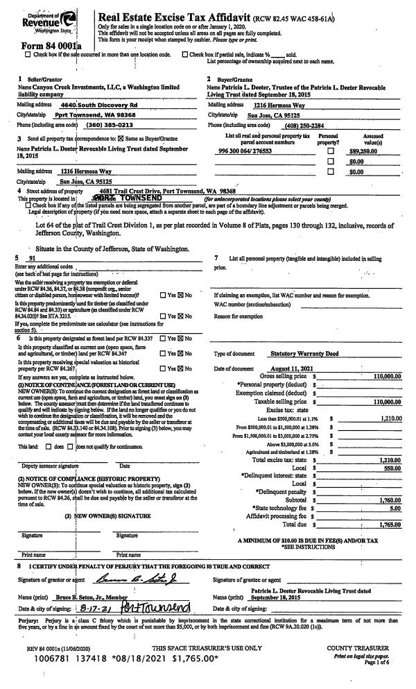 | 1 | 08/11/2021 | SWD | Statutory Warranty Deed | CANYON CREEK INVESTMENTS LLC | PATRICIA L DEETER REVOCABLE LIVING TRUST | | | $110,000.00 | 137418 | |