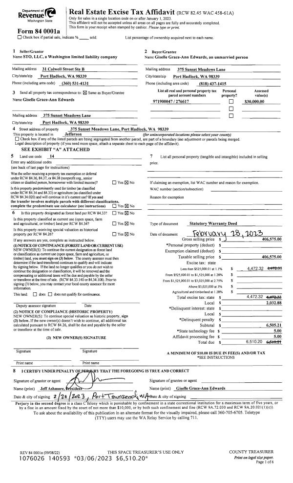 | 2 | 02/28/2023 | SWD | Statutory Warranty Deed | STO LLC | GISELLE GRACE ANN EDWARDS | | | $406,575.00 | 140593 | |