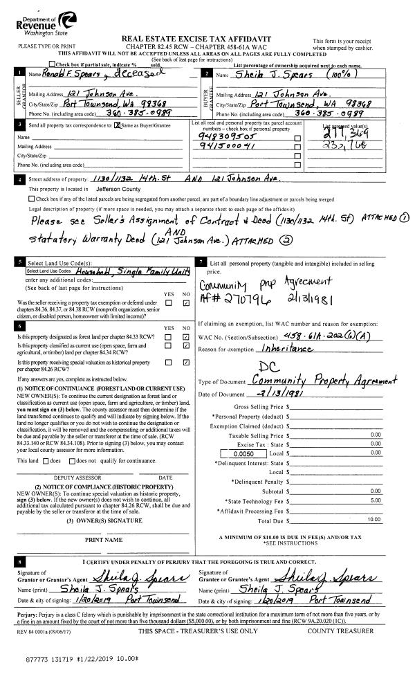 | 1 | 02/13/1981 | CPA | Community Property Agreement | RONALD F SPEARS | SHEILA J SPEARS | | | | 131719 | |