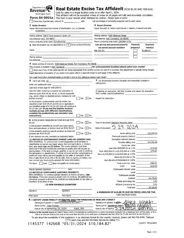 | 1 | 05/29/2024 | SWD | Statutory Warranty Deed | RICHMOND AMERICAN HOMES OF WA INC | KENNETH W NELSON | | | $624,990.00 | 142668 | |