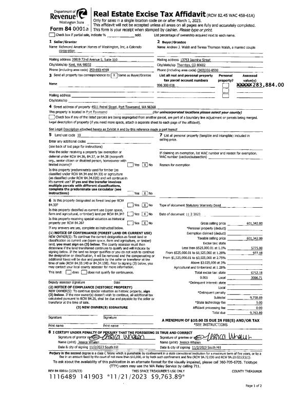 | 1 | 11/02/2023 | SWD | Statutory Warranty Deed | RICHMOND AMERICAN HOMES OF WA INC | ANDREW J & TERESA T WALSH | | | $601,342.00 | 141903 | |