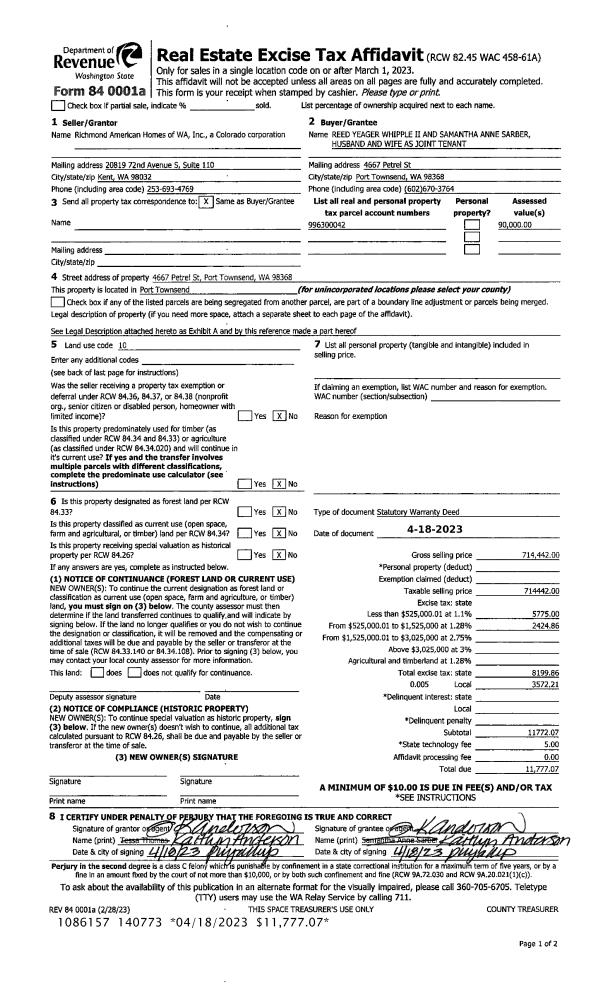 | 1 | 04/18/2023 | SWD | Statutory Warranty Deed | RICHMOND AMERICAN HOMES OF WA INC | REED Y WHIPPLE II | | | $714,442.00 | 140773 | |