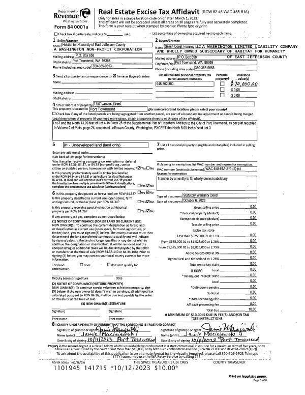 | 3 | 10/06/2023 | SWD | Statutory Warranty Deed | HABITAT FOR HUMANITY OF EAST | SALISH COAST HOUSING, LLC | | | | 141715 | |
