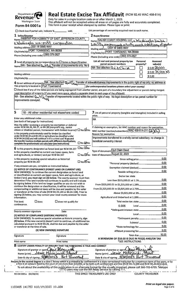 | 2 | 08/22/2023 | QCD | Quit Claim Deed | | SALISH COAST HOUSING, LLC | | | | 141753 | sidewalk/stair imp only |