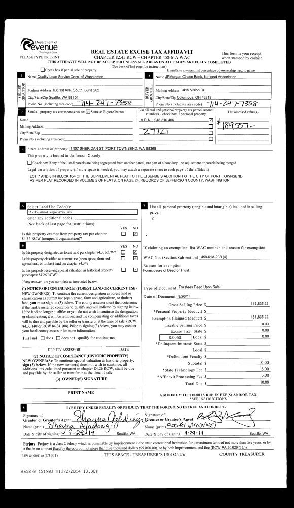 | 2 | 09/26/2014 | TRED | Trustee Deed | JENNIFER PEDERSEN | JPMORGAN CHASE BANK, NAT'L ASSOC | | | | 121983 | |