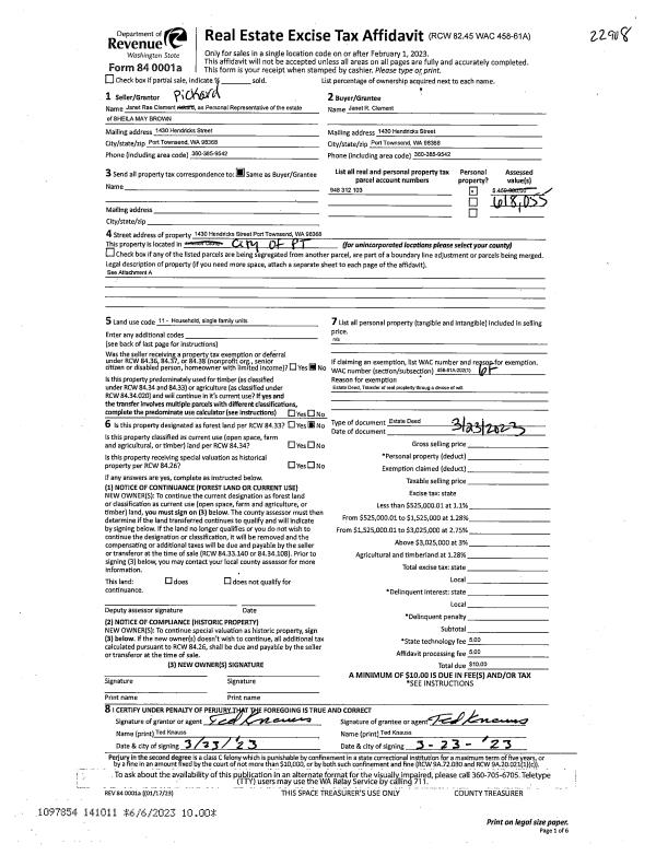 | 1 | 03/23/2023 | PRD | Personal Representatives Deed | JANET R CLEMENT PICKARD PERSONAL REPRESENTATIVE | JANET R CLEMENT | | | | 141011 | |