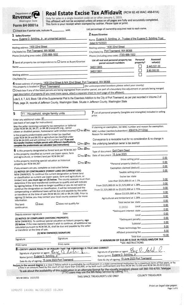 | 1 | 06/15/2023 | QCD | Quit Claim Deed | EUGENE D SCHILLING | EUGENE D SCHILLING TRUST | | | | 141081 | |