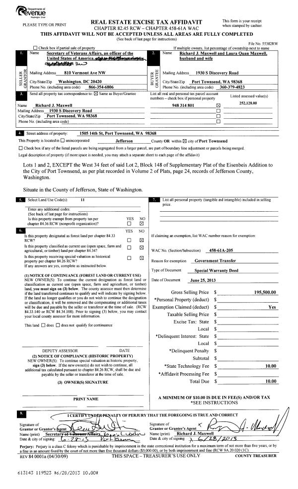 | 4 | 06/25/2013 | SPWD | Special Warranty Deed | SECRETARY OF VETERANS AFFAIRS | RICHARD J MAXWELL | | | $195,500.00 | 119523 | |