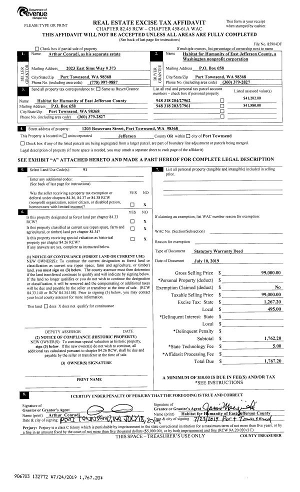 | 3 | 07/10/2019 | SWD | Statutory Warranty Deed | ARTHUR CONRADI | HABITAT FOR HUMANITY OF EAST | | | $99,000.00 | 132772 | |