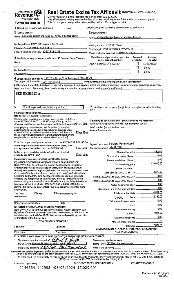 | 1 | 07/31/2024 | SWD | Statutory Warranty Deed | EDWARD E HUSTON | WILLIAM R JEVNE | | | $439,000.00 | 142998 | |