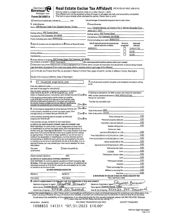 | Mailing Address: | ELIZABETH BERMAN TRUSTEE 659 THOMAS ST PORT TOWNSEND, WA 98368-2352 | % Ownership: | 100.0000000000% |