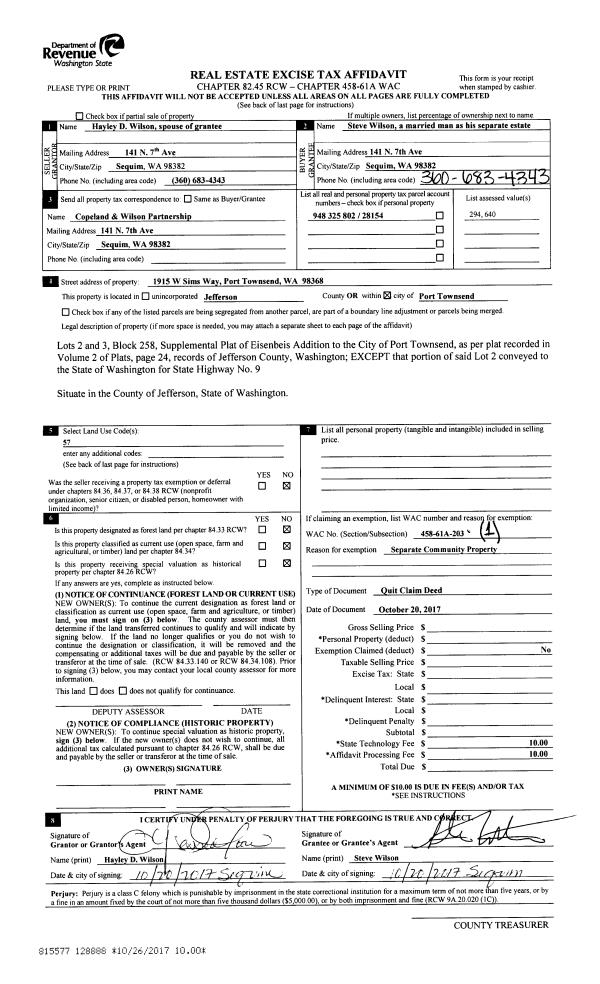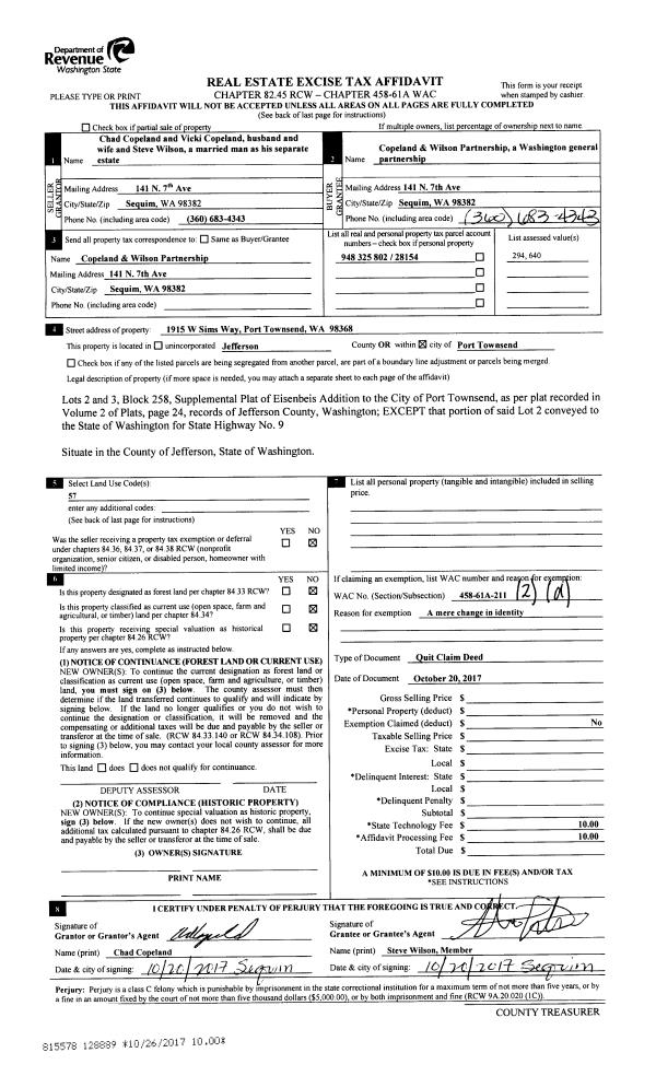 | 2 | 10/20/2017 | QCD | Quit Claim Deed | STEVE G WILSON | COPELAND & WILSON PARTNERSHIP | | | | 128889 | |