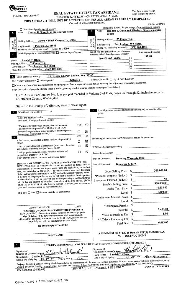 | 2 | 10/09/2019 | SWD | Statutory Warranty Deed | DONALD J BARROWS | SATCHWORKS AUTO REPAIR INC | | | $373,000.00 | 133281 | |