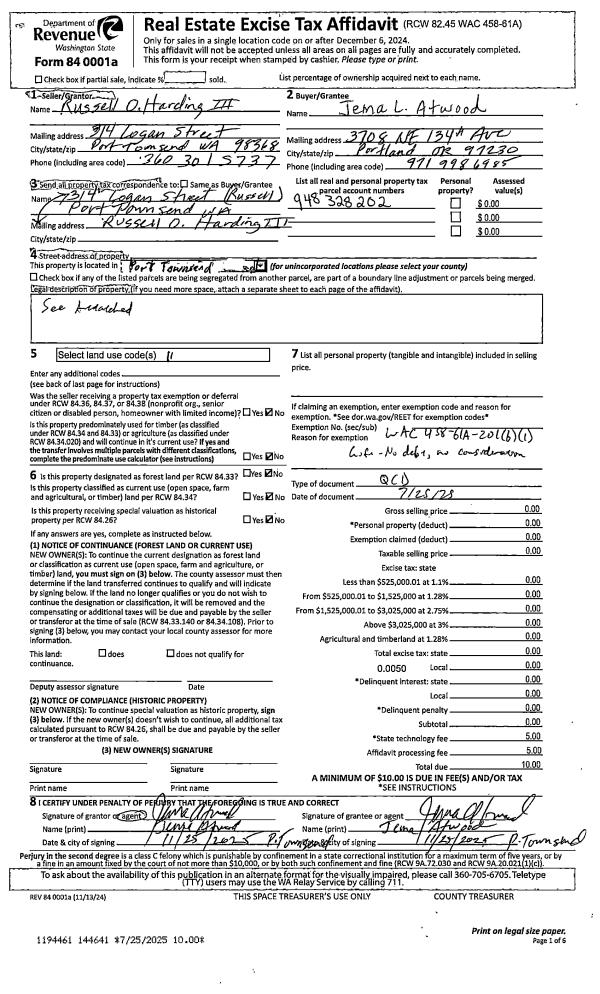 | 1 | 07/25/2025 | QCD | Quit Claim Deed | RUSSELL O HARDING | JEMA L ATWOOD | | | | 144641 | |