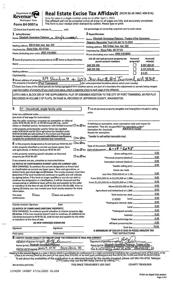 | 1 | 06/17/2025 | QCD | Quit Claim Deed | ELIZABETH G PETERSON | ELIZABETH G PETERSON REV TRUST | | | | 144587 | |