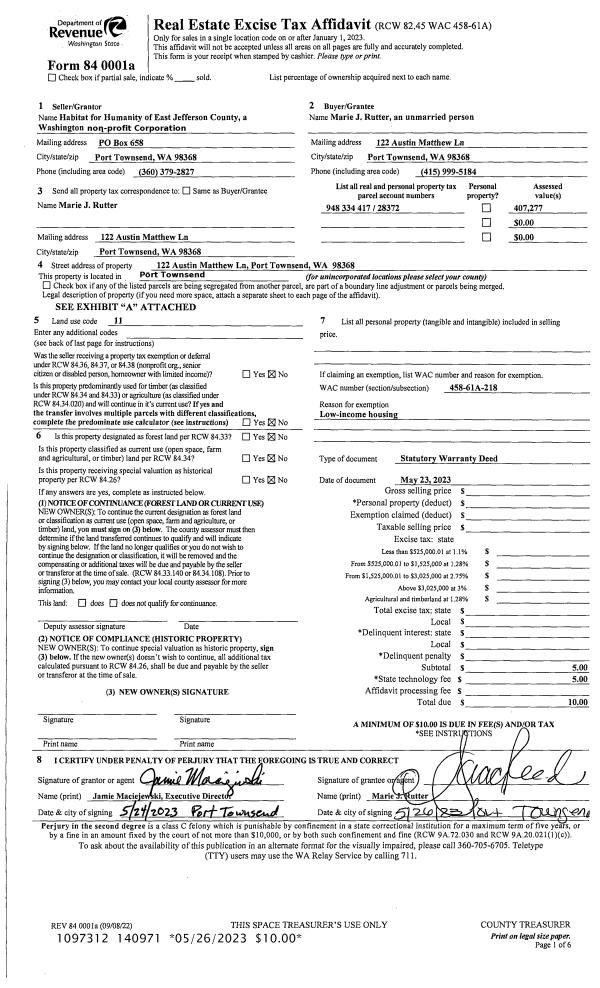 | 1 | 05/24/2023 | REST COVE | RESTRICTIVE COVENANT | SALISH COAST HOUSING, LLC | MARIE J RUTTER | | | | 0 | AF#660524 |