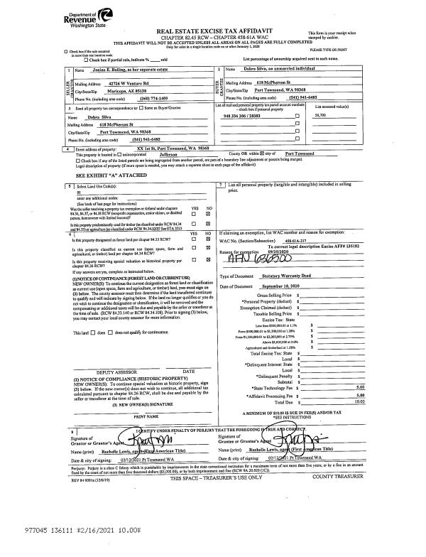 | 3 | 09/18/2020 | SWD | Statutory Warranty Deed | JANINE E BOLLING | DEBRA SILVA | | | $75,000.00 | 135182 | |